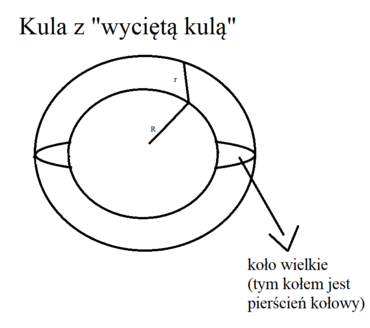 <p>Kula "z wyciętą kulą" - kula, która ma "wycięty' utwór na mniejszą kulę. Jej kołem wielkim jest pierścien kołowy.</p>