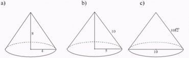 <p>Oblicz objętość i pole powierzchni całkowitej z podanych stożków.</p>